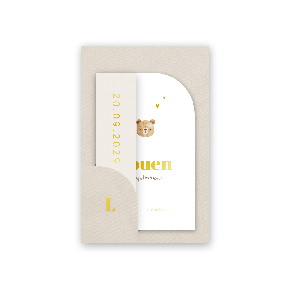 Neutraal insteek geboortekaartje met beertje en foliedruk
