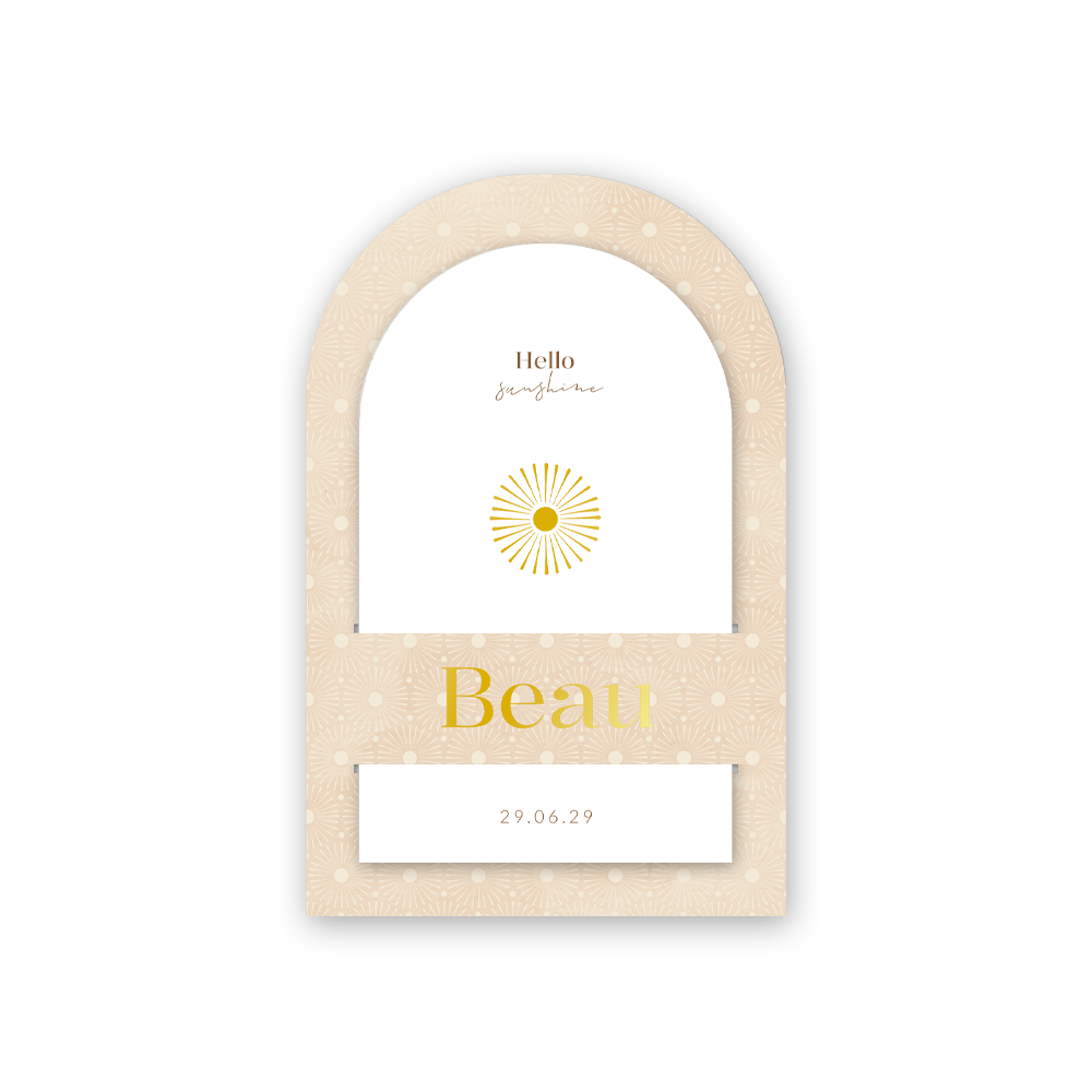 Een prachtig unisex geboortekaartje met insteek voor een jongen of meisje. Dit geboortekaartje Beau heeft een hoofdkaart en een insteekkaart in een boogvorm. Het goudfolie zorgt voor een extra vleugje luxe. Het vrolijke, zonnige patroon geeft een warme sfeer aan dit geboortekaartje voor jullie zoon of dochter. Pas dit kaartje naar eigen wens aan in onze online editor voor de persoonlijke warme touch.