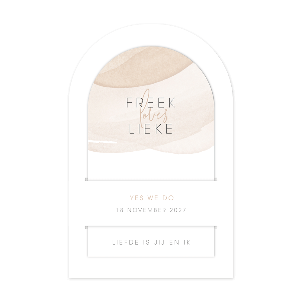 Jullie unieke trouwdag vraagt om een unieke uitnodiging! Deze prachtige insteek trouwkaart in aquarel nude stijl is perfect om jullie speciale dag mee aan te kondigen. De kaart is voorzien van een witte trouwkaart met een ingestoken kaart met beige aquarel vegen. Beide kaarten hebben een boogvorm.