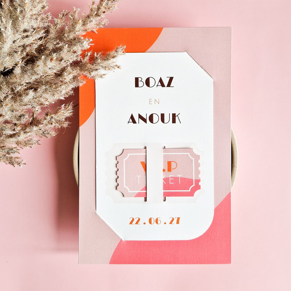 Gaan jullie trouwen? Kondig het aan met deze hippe insteek trouwkaart. Deze huwelijksuitnodiging is voorzien van een vierkante kleurrijke trouwkaart met een ingestoken witte kaart met afgeronde hoeken en ingestoken VIP ticket coupon. De kleurencombinatie van roze met oranje geven deze originele trouwkaart een frisse uitstraling. Wie nodig jij als VIP uit naar jullie bruiloft?