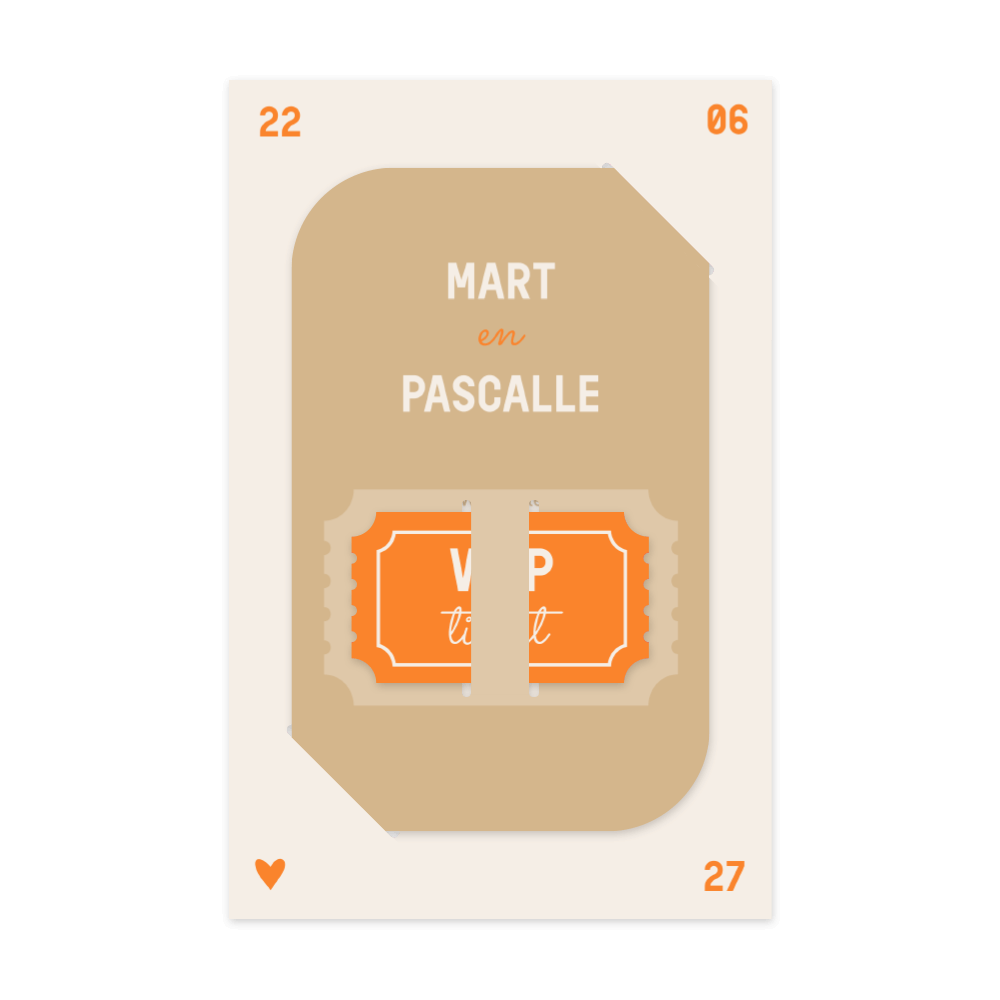Wanneer je op zoek bent naar een unieke en originele huwelijksuitnodiging, dan is deze insteek trouwkaart echt iets voor jullie. Deze luxe huwelijksuitnodiging is voorzien van een beige trouwkaart met een ingestoken bruine kaart met afgeronde hoeken en een ingestoken VIP ticket coupon. De oranje accenten geven deze trouwkaart een frisse en hippe uitstraling.