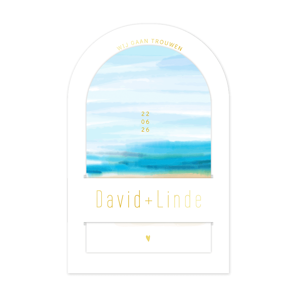 Gaan jullie binnenkort trouwen? Kondig je huwelijk dan aan met deze prachtige insteek trouwkaart. Deze huwelijksuitnodiging heeft een originele boogvorm. De hoofdkaart is wit met een ingestoken kaart met een aquarel van een strand met zee. Deze originele trouwkaart is perfect voor een strandbruiloft of als jullie beiden houden van het strand. De goudfolie geeft een sprankelende touch aan deze minimalistische kaart voor jullie bruiloft.