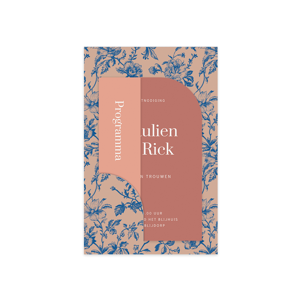 Op zoek naar een originele trouwkaart? Zoek niet verder! Deze trouwkaart is voorzien van de nieuwste trends, een prachtige insteekkaart om jullie grote dag mee aan te kondigen aan vrienden en familie. Op de trouwkaart staat een delfts blauw bloemenpatroon met een ingestoken halve boogvorm kaart en langwerpig kaartje.