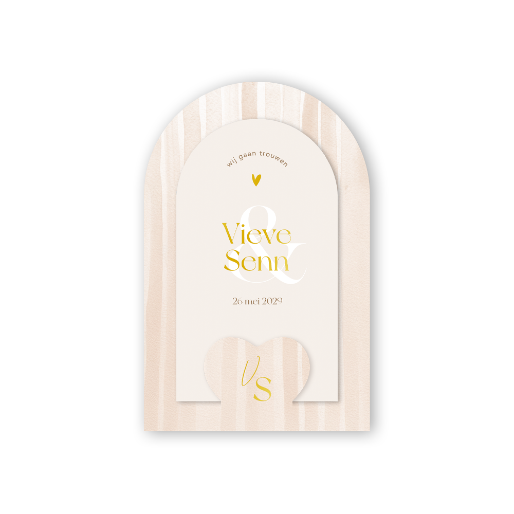 Gaan jullie binnenkort trouwen? Kondig je huwelijk dan aan met deze prachtige insteek trouwkaart met strepen, ampersand en initialen. Deze huwelijksuitnodiging is voorzien van een gestreepte beige trouwkaart met een ingestoken kaart met een wit &-teken en jullie namen in prachtig goudfolie. Beide kaarten worden gesneden in de vorm van een boog. De goudfolie geeft een sprankelende touch aan deze minimalistische kaart voor jullie bruiloft.