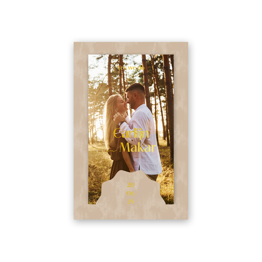 Gaan jullie binnenkort trouwen? Kondig je huwelijk dan aan met deze prachtige insteek trouwkaart. Deze huwelijksuitnodiging is voorzien van twee kaartjes, een hoofdkaart met een insteekkaart. Zet een mooie eigen foto van jullie als stralend verloofd stel op de insteekkaart. Hier staat in goudfolie jullie namen en 'Yes we do'. De hoofdkaart heeft een mooie patroon van beige pantervlekken. De goudfolie geeft een sprankelende touch aan deze trouwkaart voor jullie bruiloft.
