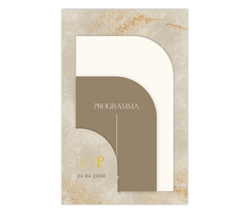 Op zoek naar een originele trouwkaart? Zoek niet verder! Deze trendy trouwkaart is voorzien van de nieuwste trends, een prachtige insteekkaart om jullie grote dag mee aan te kondigen aan vrienden en familie. De trouwkaart heeft een mooie beige marmerlook met initialen. De ingestoken kaartjes zijn beige en bruin met de namen van het bruidspaar en het programma. Beide kaartjes hebben een halve boogvorm. Jullie namen en initialen worden gedrukt in echt goudfolie wat een extra luxe afwerking geeft aan deze al unieke trouwkaart.