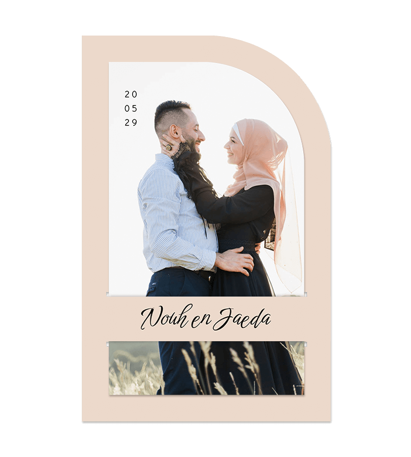 Prachtige islamitische insteekkaart om jullie grote dag mee aan te kondigen aan vrienden en familie. Deze huwelijksuitnodiging is voorzien van een zandkleurige trouwkaart met een ingestoken kaart. Zet op dit kleinere insteekkaartje een foto van jullie als toekomstig bruidspaar. De unieke halve boogvorm van zowel de trouwkaart als de insteekkaart met foto geeft een bijzonder en stijlvol effect aan jullie Arabische trouwkaart.