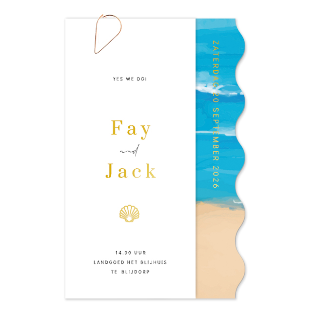 Kondig jullie huwelijk aan met deze stijlvolle trouwkaart. Deze huwelijksuitnodiging is voorzien van een achterkaart met een aquarel van een strand met zee. De uitsnede van golven passen helemaal binnen het strand thema. Het witte labelkaartje heeft een langwerpig formaat met jullie namen, schelp en de tekst 'Yes we do'. De gouden foliedruk geeft een extra luxe uitstraling aan deze originele trouwkaart. De trouwkaart en het label zijn aan te passen in de editor.