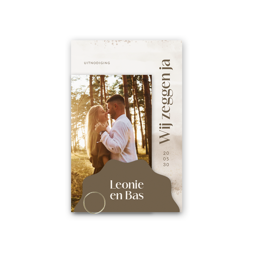 Een fantastische label trouwkaart met jullie eigen foto. Deze label trouwkaart bestaat uit drie kaarten. Een hoofdkaart met de tekst 'Wij zeggen ja', een middelgrote kaart met ruimte voor jullie eigen foto en een klein kaartje met de namen van het bruidspaar. Deze gehele kaart is in onze online editor naar eigen wens aan te passen. Bevestig de labelkaart met een stijlvolle paperclip aan elkaar vast en maak er een prachtige trouwdag van.
