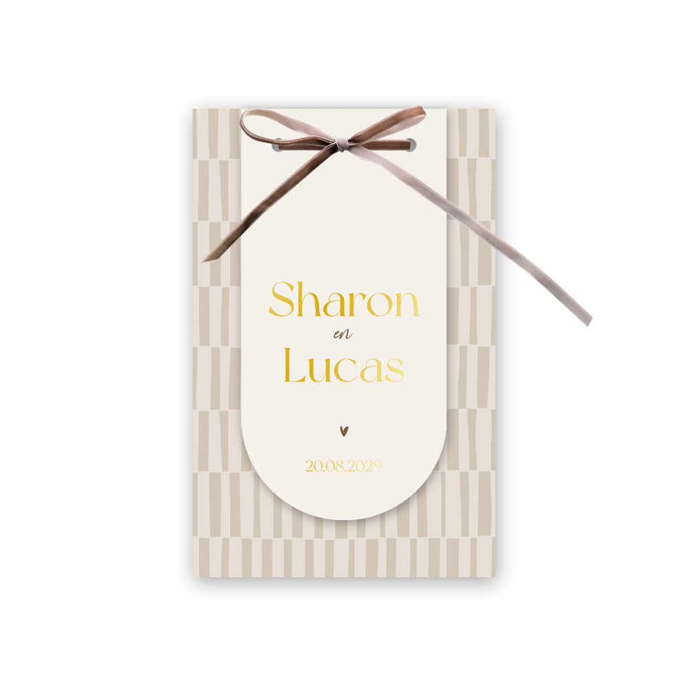 Prachtige labelkaart met fluwelen lint en goudfolie. Deze trouwkaart is origineel en hip. De uitnodiging bestaat uit een rechthoekige kaart met een streep patroon met daarvoor een boogvormig kaartje in een zachte zandkleur. Het subtiele glanseffect van de folieaccenten en de verfijnde touch van het velours taupe lint zorgen voor een stijlvolle en exclusieve uitstraling. Bestel vandaag nog deze trouwkaart en maak van jullie speciale dag een onvergetelijke ervaring.