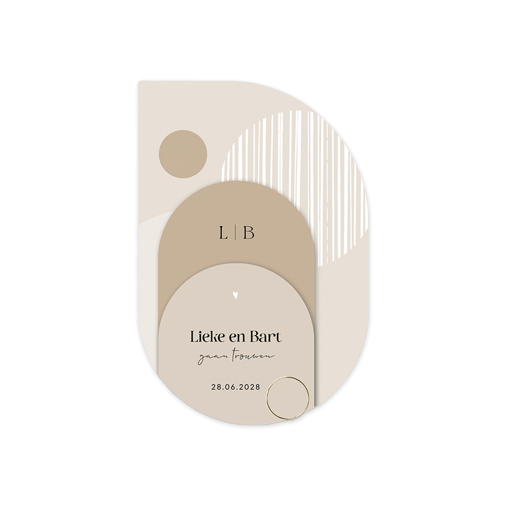 Op zoek naar een unieke en trendy trouwkaart? Deze prachtige label trouwkaart in Japandi stijl is uniek door de bijzondere organische vormen.