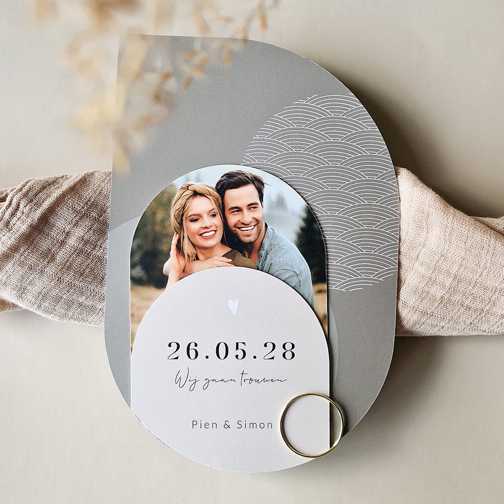 Prachtige label trouwkaart in Japandi stijl. Deze trouwkaart is uniek door de bijzondere organische vormen. Helemaal leuk is dat er op één van de labels ruimte is voor een eigen foto.