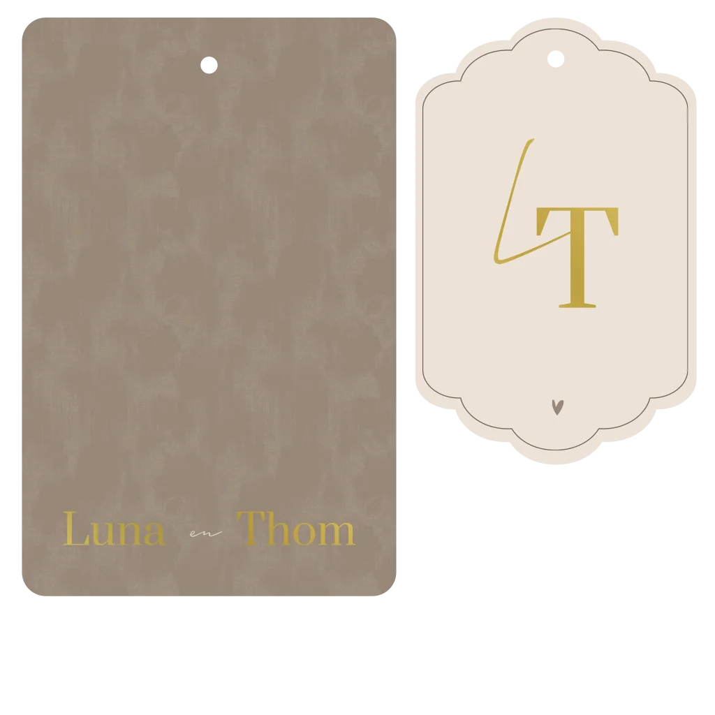 Sierlijke labelkaart met goudfolie. Deze trouwkaart is origineel en heeft een luxe uitstraling. De uitnodiging bestaat uit twee labels. Een hoofdkaart met afgeronde hoeken en een panterprint patroon en een label in aparte vorm met initialen in goudfolie. De combinatie van het design met de aparte vorm en goudfolie geeft een stijlvolle en exclusieve uitstraling. Bestel vandaag nog deze trouwkaart en maak van jullie speciale dag een onvergetelijke ervaring.