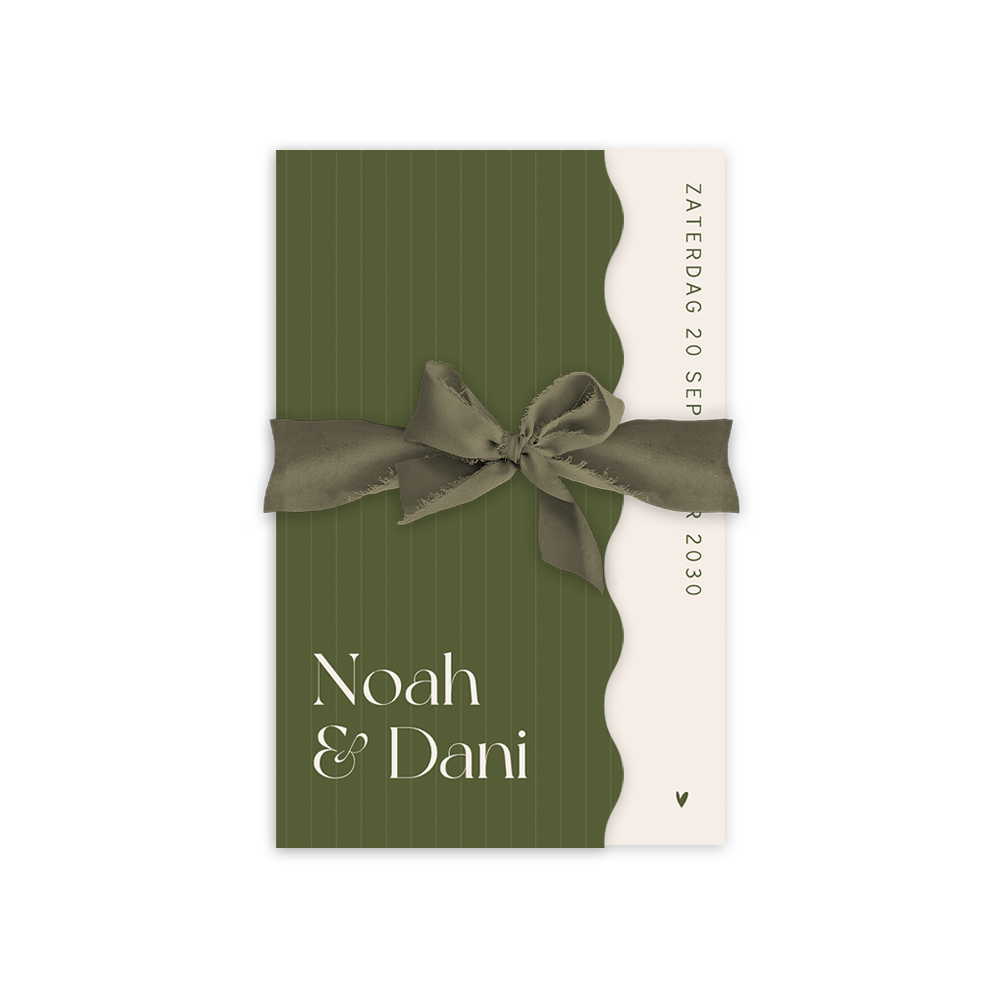 Kondig jullie huwelijk aan met deze originele trouwkaart. Deze huwelijksuitnodiging is voorzien van een groene hoofdkaart met strepen en een uitsnede van golven. Daarvoor een beige label die je aan de hoofdkaart bevestigd met een mooi zijden strik. De trouwkaart en het label zijn aan te passen in de editor.