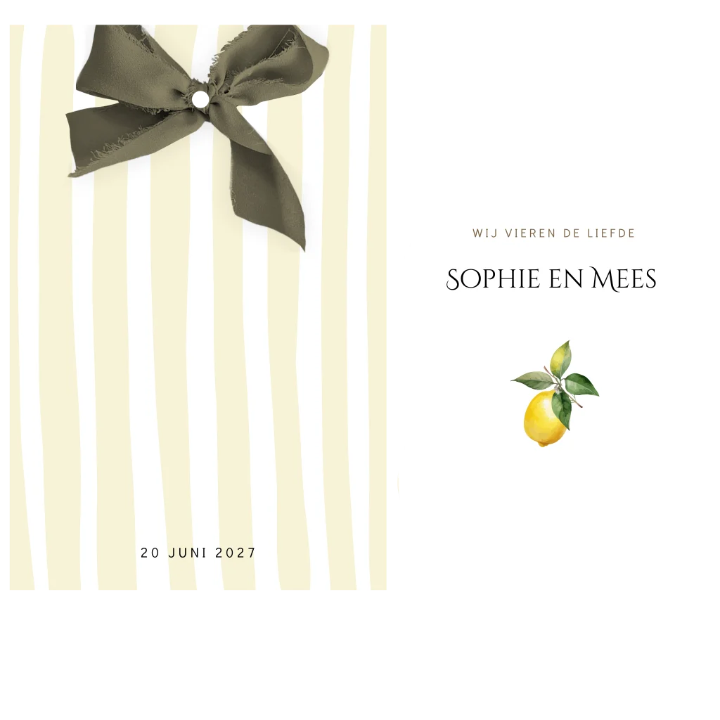 Prachtige labelkaart met zijden chiffon strik. Deze trouwkaart is origineel en hip met een mediterraans tintje, ideaal voor een zomer bruiloft. De uitnodiging bestaat uit een rechthoekige kaart met een gestreept patroon met daarvoor een golfvormig kaartje in een witte kleur met een citroentje. Alles is geheel naar eigen wens aan te passen in de editor. Maak deze labelkaart geheel in stijl af met de bijpassende donkergroene envelop.| Totaalprijs: 0 |