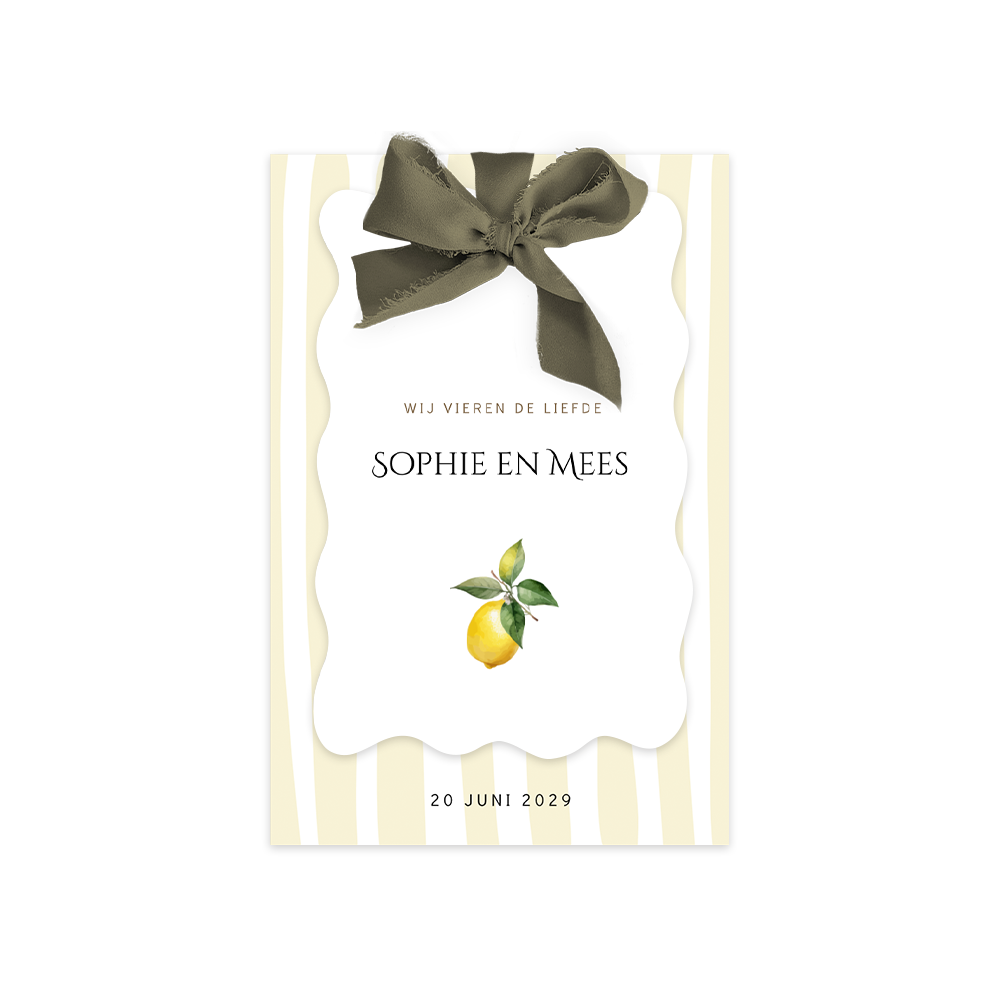 Prachtige labelkaart met zijden chiffon strik. Deze trouwkaart is origineel en hip met een mediterraans tintje, ideaal voor een zomer bruiloft. De uitnodiging bestaat uit een rechthoekige kaart met een gestreept patroon met daarvoor een golfvormig kaartje in een witte kleur met een citroentje. Alles is geheel naar eigen wens aan te passen in de editor. Maak deze labelkaart geheel in stijl af met de bijpassende donkergroene envelop.