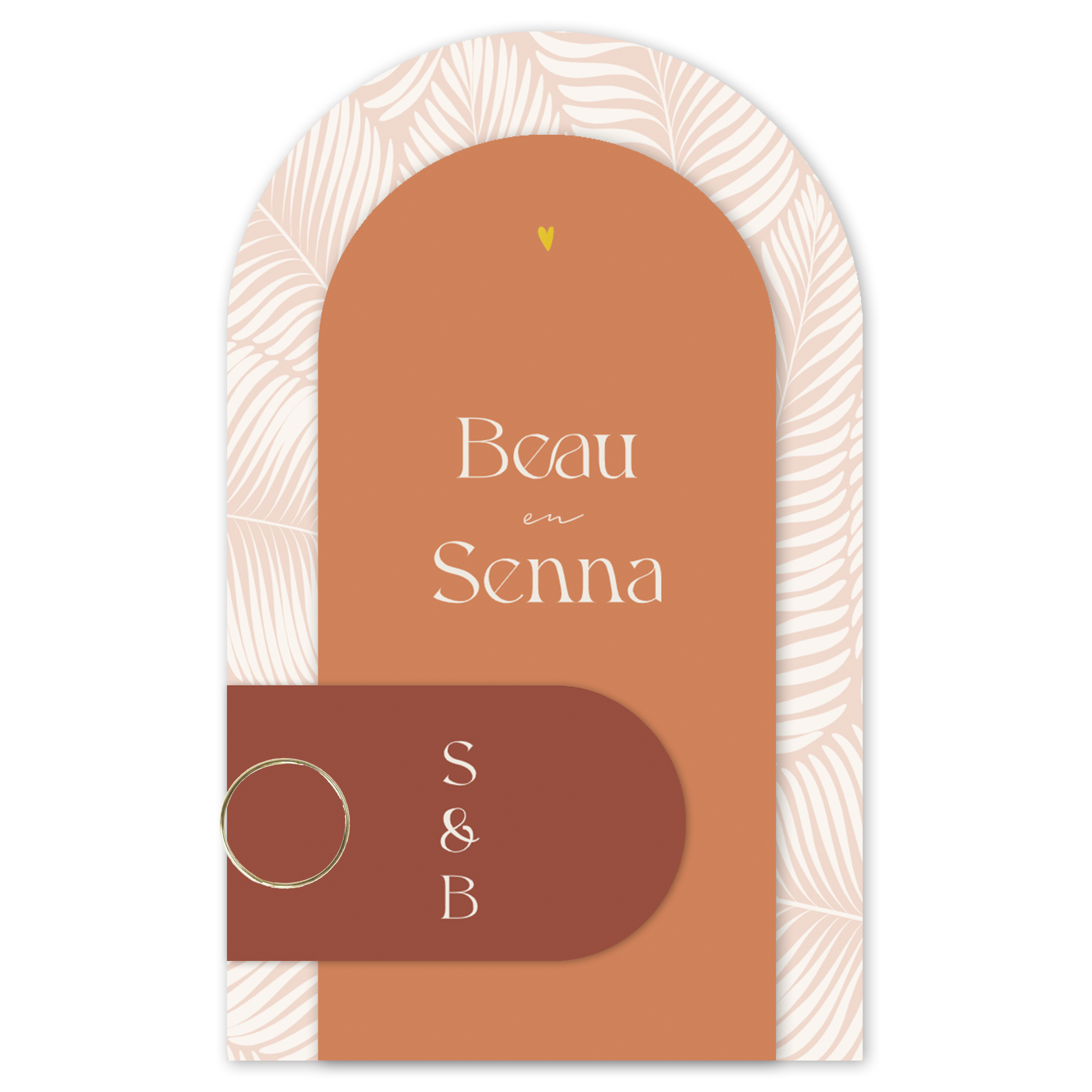 Deze huwelijksuitnodiging bestaat uit drie boogvormige kaarten die je met een hippe paperclip aan elkaar kunt bevestigen. Dit geeft de kaart een luxe uitstraling en past helemaal bij de huidige trends op het gebied van trouwkaarten. De labels hebben een rustig patroon van terracotta met bladeren.