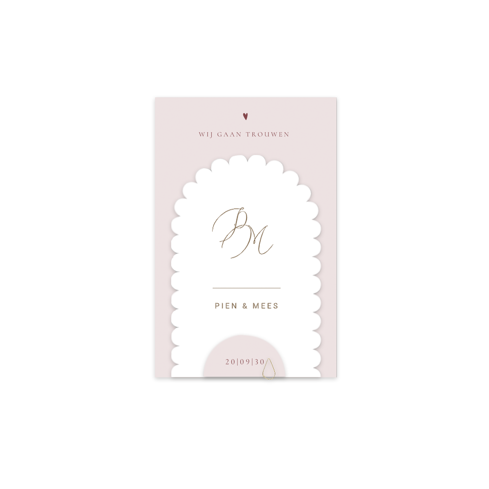 Prachtige labelkaart met een chique uitstraling. Deze trouwkaart heeft een minimalistisch design maar zal zeker opvallen door de bijzondere labels en vormen. De uitnodiging bestaat uit een rechthoekige roze kaart met mooie boogvormige kaart met initialen en een klein boogvormig kaartje. Bestel vandaag nog deze trouwkaart en maak van jullie speciale dag een onvergetelijke ervaring.
