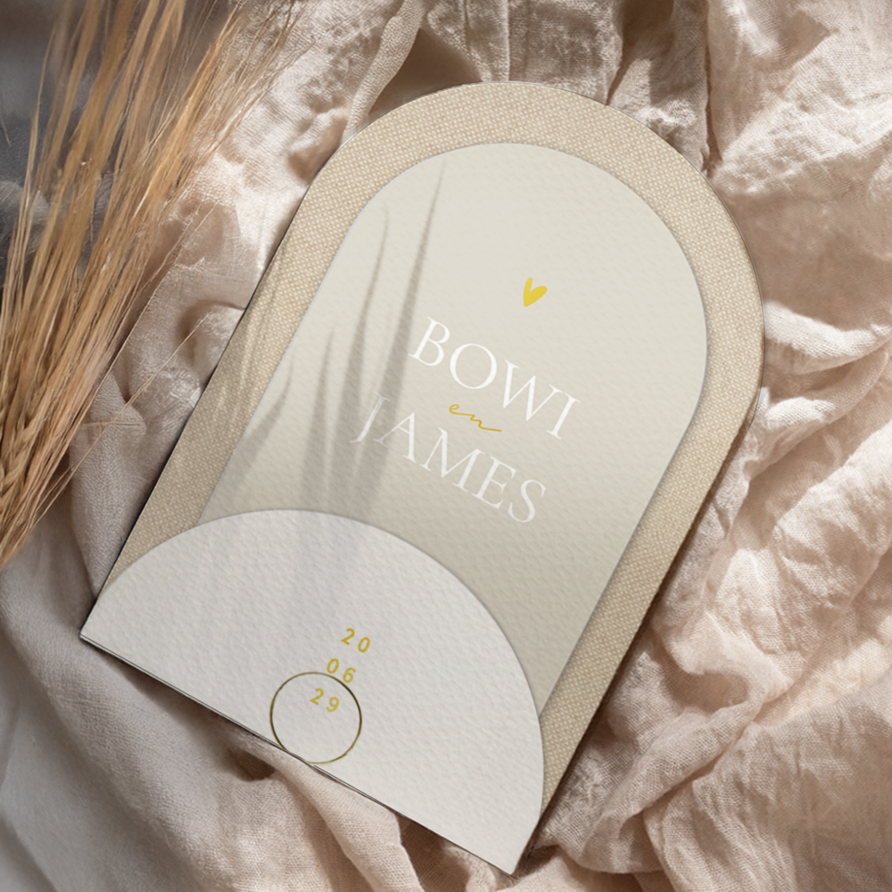 Bijzondere trouwkaart met meerdere labeltjes die je aan elkaar bevestigt met een paperclip. Deze trouwkaart heeft een rustig linnenlook design in zachte beige met witte tinten. De goudfolie geeft een extra luxe uitstraling aan deze originele trouwkaart. De trouwkaart en de labels zijn aan te passen in de editor.
