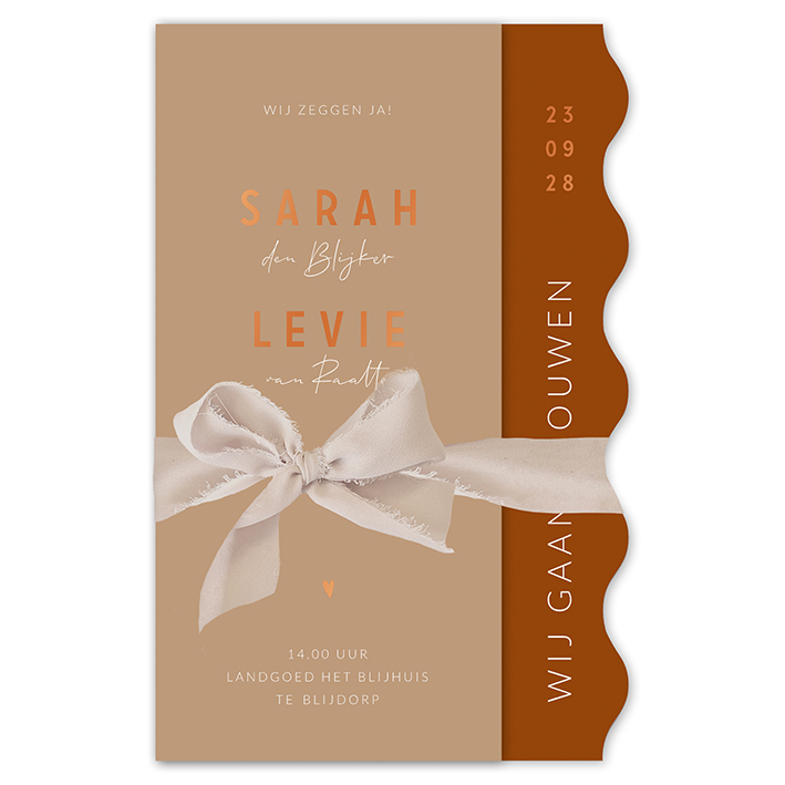 Kondig jullie huwelijk aan met deze stijlvolle trouwkaart. Deze huwelijksuitnodiging is voorzien van een koperkleurige kaart met een organische uitsnede van golven. Daarvoor een langwerpige labelkaart met jullie namen in écht hoogglans. Bevestig de kaarten aan elkaar door het zijden lint. Dit geeft een originele look aan deze neutrale trouwkaart.
