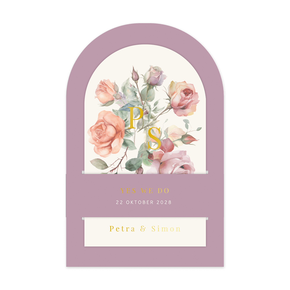 Op zoek naar een originele en romantische trouwkaart? Dan is deze trouwkaart met insteekkaartjes en rozen echt iets voor jullie! Deze exclusieve trouwkaart is voorzien van een lila paarse trouwkaart met een ingestoken beige kaart met een aquarel van rozen in zachte roze en paarse tinten. Beide kaarten hebben een mooie boogvorm. Jullie initialen, namen en de tekst ´Yes we do´ worden gedrukt in echt goudfolie. Dat geeft een nóg luxer tintje aan deze al bijzondere trouwkaart.