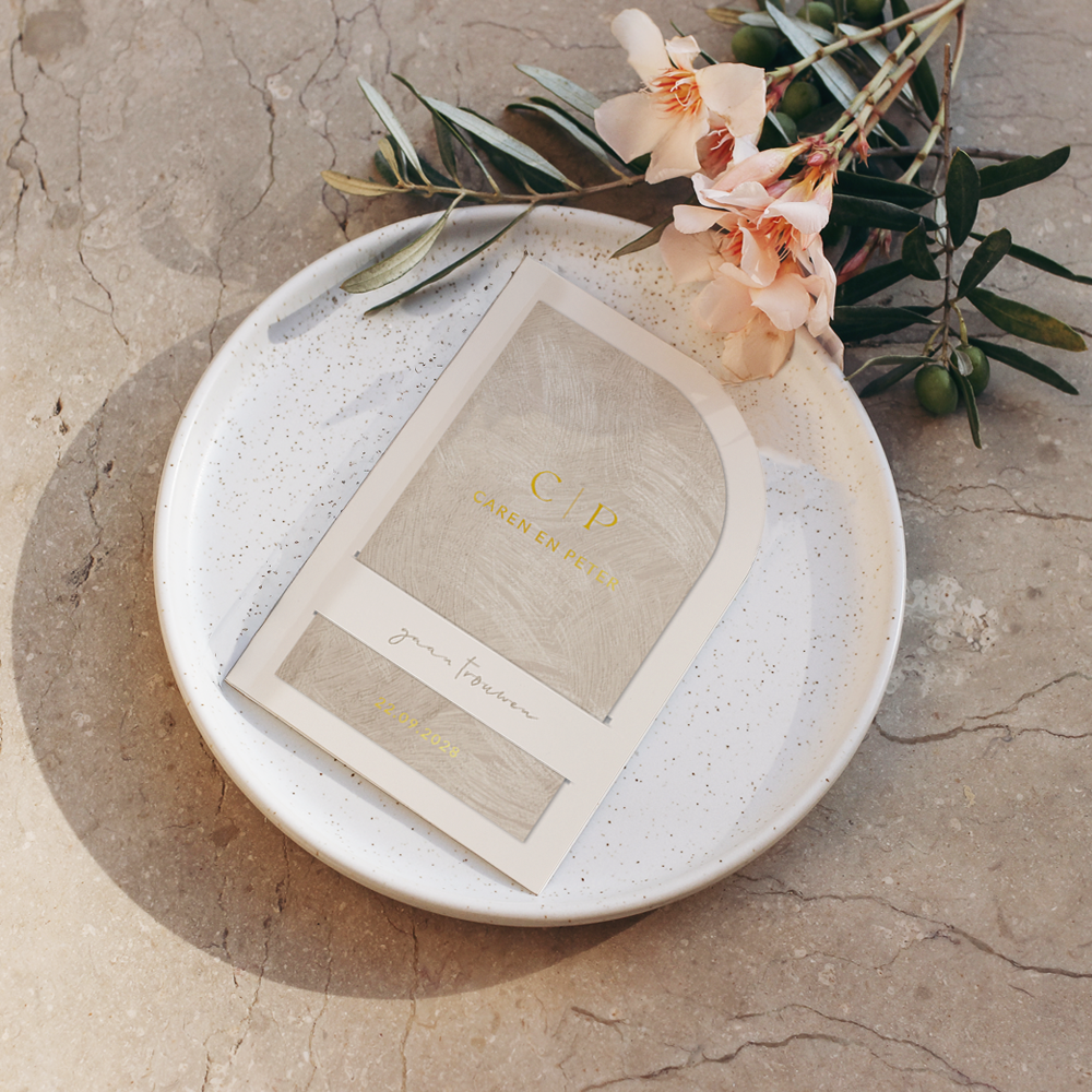 Ga mee met de allernieuwste trends met deze originele trouwkaart, een prachtige insteekkaart om jullie grote dag mee aan te kondigen aan vrienden en familie. Deze huwelijksuitnodiging is voorzien van een beige trouwkaart met een ingestoken kaart met een metallic gouden look met vegen en jullie initialen en namen. Beide kaarten hebben een halve boogvorm met écht goudfolie. De foliedruk geeft een extra luxe uitstraling aan deze originele trouwkaart.