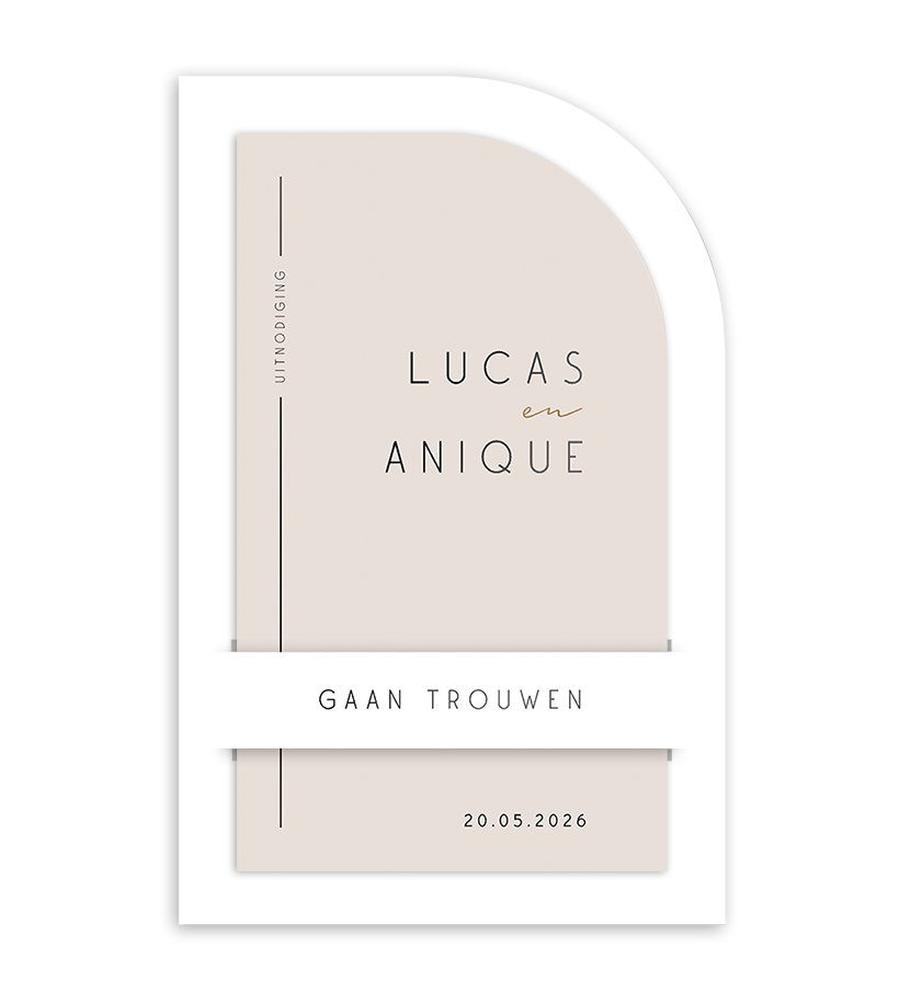 Ga mee met de allernieuwste trends met deze originele trouwkaart, een prachtige insteekkaart om jullie grote dag mee aan te kondigen aan vrienden en familie. Deze huwelijksuitnodiging is voorzien van een witte trouwkaart met een ingestoken beige kaart. Beide kaarten hebben een halve boogvorm met écht zwartfolie. De foliedruk geeft een extra luxe uitstraling aan deze originele trouwkaart.
