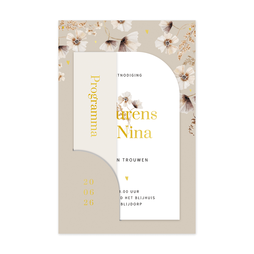 Op zoek naar een originele trouwkaart? Zoek niet verder! Deze trendy trouwkaart is voorzien van de nieuwste trends, een prachtige insteekkaart om jullie grote dag mee aan te kondigen aan vrienden en familie. Deze huwelijksuitnodiging is voorzien van een beige trouwkaart met veldbloemen met daarin een ingestoken afgeronde witte kaart met jullie namen en bloemen en een klein kaartje met het dagprogramma van jullie bruiloft. Alle kaarten zijn voorzien van écht glanzend goudfolie. De foliedruk geeft een extra luxe uitstraling aan deze bijzondere trouwkaart.