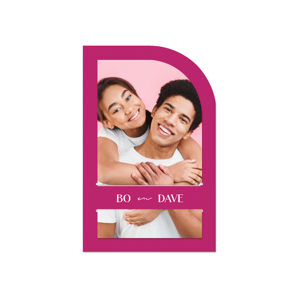 Een toffe insteekkaart om jullie huwelijksdag mee aan te kondigen aan vrienden en familie. Deze trouwkaart is voorzien van een donkerroze kaart met een insteekkaart met eigen foto. Voeg jullie eigen foto toe voor de persoonlijke touch. Beide kaarten hebben een originele halve boogvorm.