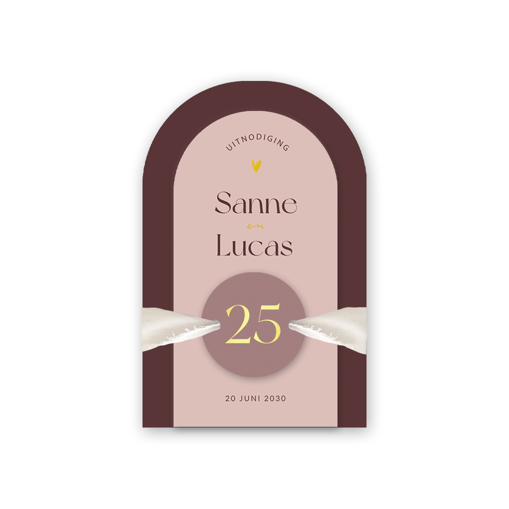 Een jubileumuitnodiging met één of meerdere labeltjes, hoe bijzonder is dat? Kondig jullie 25 jarig huwelijksjubileum aan met deze originele en stijlvolle label uitnodigingskaart. Deze jubileumuitnodiging heeft een rustig design en mooie warme kleuren in rood, paars en roze. De goudfolie geeft een extra luxe uitstraling aan deze originele jubileumkaart. De kaart en de labels maak je aan elkaar vast met een mooi zijden chiffon lint. Dit lint wordt niet standaard meegeleverd, maar is bij te bestellen. Ga direct naar: chiffon lint