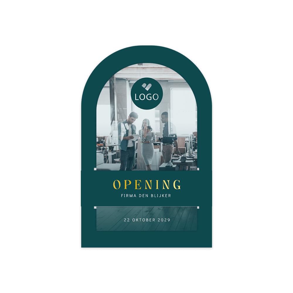 Luxe en originele zakelijke uitnodiging voor een zakelijke opening. Deze uitnodiging is van alle luxe voorzien, het is een insteekkaart in apart boog vorm en heeft foliedruk. Maak de uitnodiging af door een eigen foto en je eigen bedrijfslogo toe te voegen.