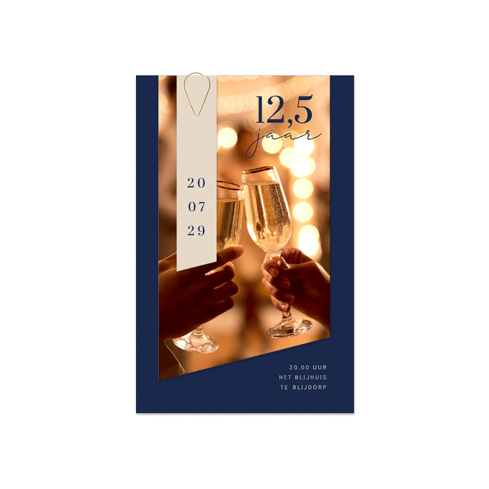 Stijlvolle zakelijke uitnodiging als labelkaart met paperclip. Deze zakelijke jubileum labelkaart heeft een luxe uitstraling met een sfeerfoto van proostende champagneglazen.