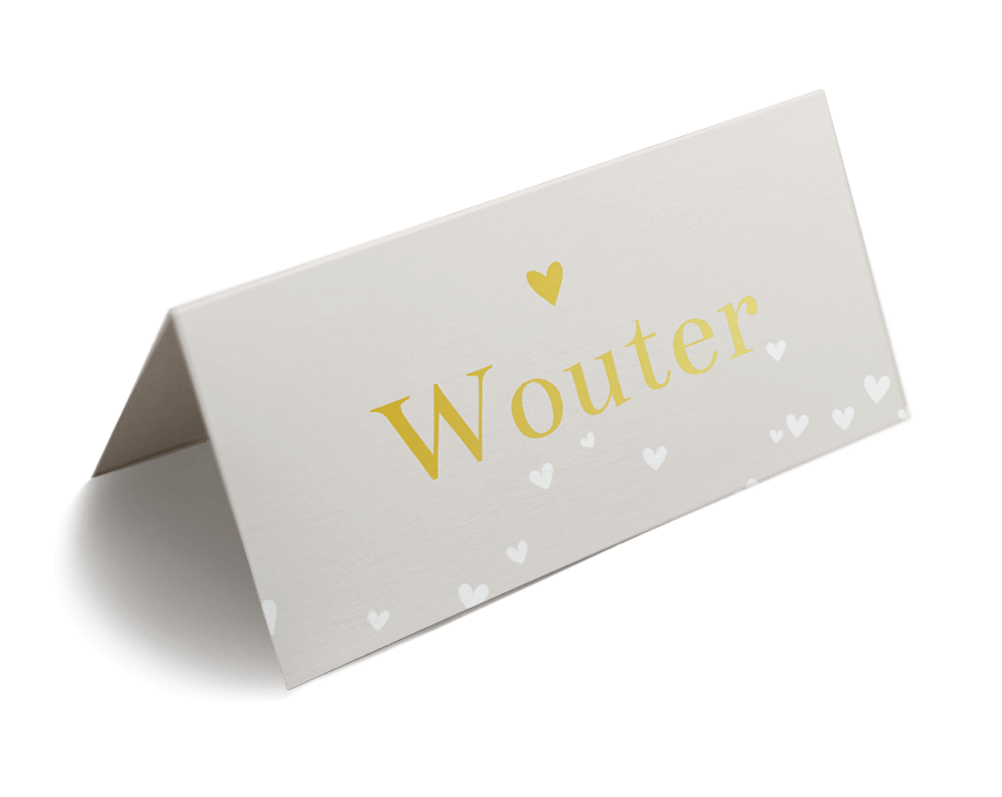 Gevouwen naamkaartjes voor een bruiloft. Deze trendy naamkaartjes kun je gebruiken als plaatsbepaling voor de ceremonie of voor het diner. Deze naamkaartjes zijn voorzien van goudfolie met hartjes, wat een romantische en luxe uitstraling geeft.