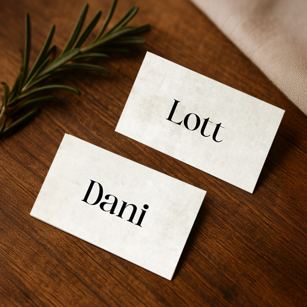 Minimalistische naamkaartjes voor tijdens het diner van jullie huwelijksdiner. Elk minikaartje is apart aan te passen in onze editor.