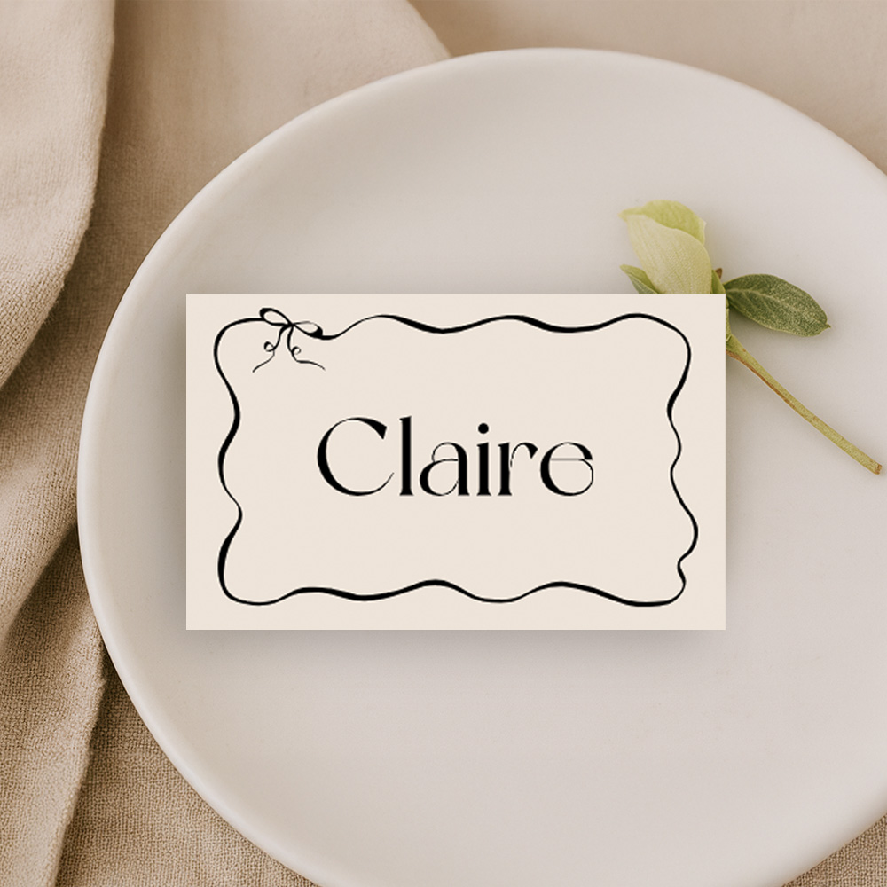 Op deze naamkaartjes staat een speels golvend kader met een geïllustreerde strik. Deze naamkaartjes passen perfect bij deze trouwkaart. Elk minikaartje is apart aan te passen in onze editor.