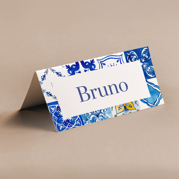 Hoe leuk is het om je trouw huisstijl door te voeren naar alle bruiloft decoratie, waaronder deze prachtige naamkaartjes in mediterraanse stijl. Deze naamkaartjes zijn voorzien van een patroon van blauwe Portugese tegeltjes. Met deze dubbel gevouwen naamkaartjes maak je de eettafel helemaal compleet en weten al je gasten hun plek meteen te vinden.