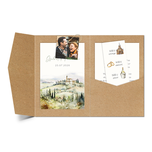 Houden jullie van het Toscaanse landschap in Italië of gaan jullie trouwen in het buitenland? Dan is deze unieke en stijlvolle trouwkaart zeker geschikt! Je ziet op de hoofdkaart een aquarel landschap in Toscane met cipressen en een prachtig Italiaans 'fattoria'. De complete set trouwkaarten is geschilderd in deze prachtige Italiaanse stijl.