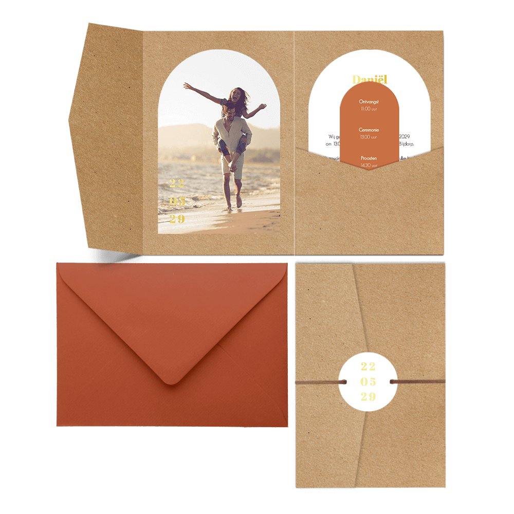 Verstuur jullie huwelijksuitnodiging als complete set in een pocketfold mapje. De arch vormige kaarten uit dit setje hebben een mooie grote foto en de huwelijksdatum wordt gedrukt in luxe goudfolie, de datum komt ook terug op het ronde labeltje. Op het langwerpige kaartje kun je de dagindeling weergeven.