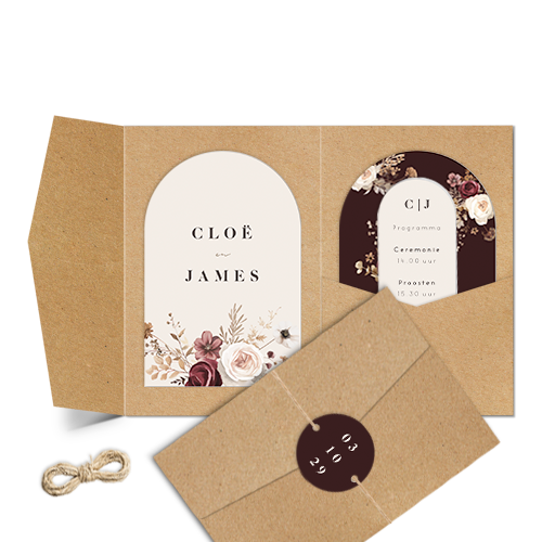 Complete trouwkaarten set voor in een pocketfold mapje. Deze exclusieve kaarten hebben mooie boogvormen met een illustratie van romantische bloemen.
