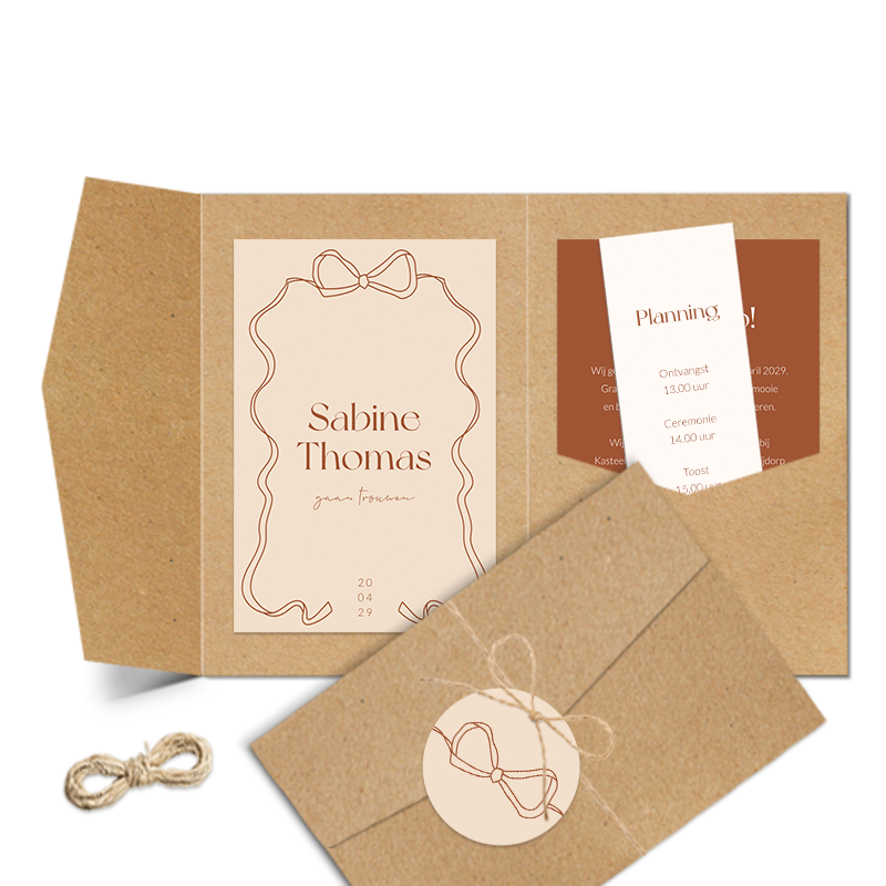 Complete set voor in een pocketfold mapje. Op de hoofdkaart staan jullie namen met een golvend kader van een strik.