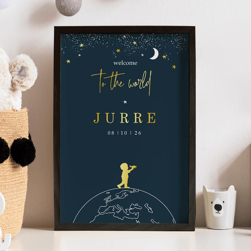 Foliedruk geboorteposter met een wereldbol, maan en sterren