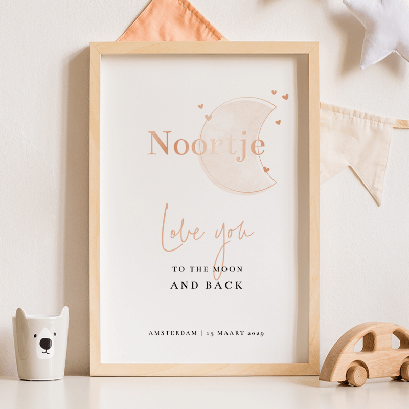 To the moon and back! Lieve geboorteposter met roséfolie voor een dochter. Op deze poster staat een aquarel maan in de kleur pastelroze. Daar omheen een mooi lijntje en kleine hartjes in roséfolie. Ook de naam wordt gedrukt in echt roséfolie. Dit geeft de kaart een exclusieve uitstraling. Verder is de kaart overwegend wit en oogt daardoor rustig. De kleuren zijn aan te passen in de editor.