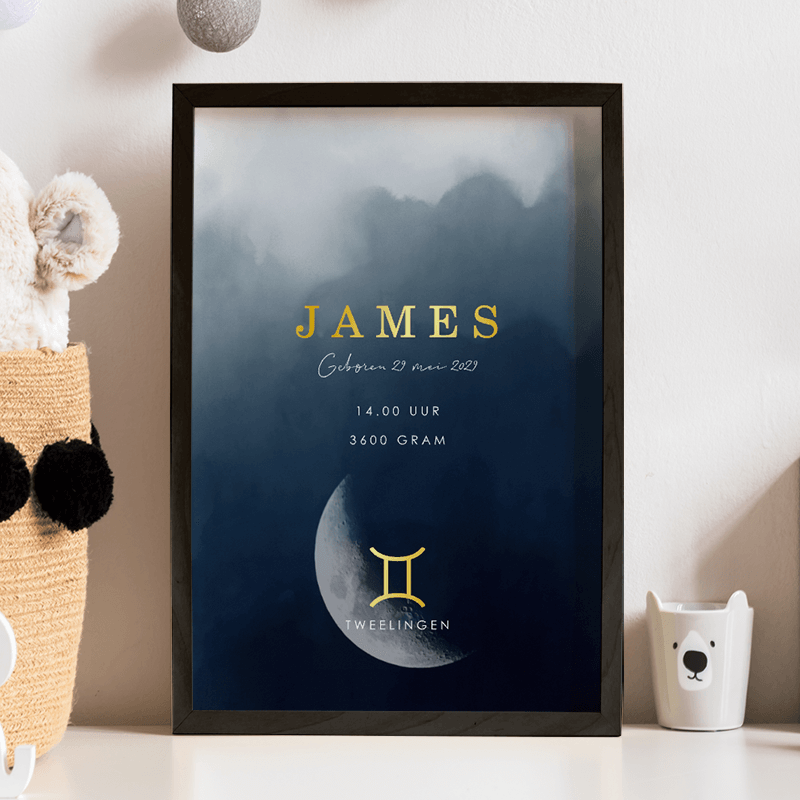 Sterrenbeeld geboorteposter met foliedruk. Op deze poster worden de babynaam en het astrologische symbool van het sterrenbeeld gedrukt in echt goudfolie. Personaliseer deze sterren poster met naam, geboortedatum en eventuele andere geboortegegevens zoals geboorte tijdstip of geboorteplaats. Ook mogelijk met een ander sterrenbeeld dan tweelingen.