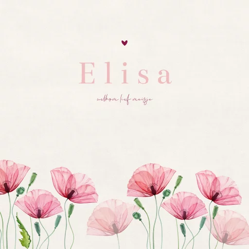 Vrolijke canvasposter met houten magneetlatjes voor de geboorte van jullie dochter. Op deze geboorteposter Elisa staan vrolijke klaproosjes, de geboortebloem van Augustus. De klaproos staat voor verbeelding! Leuk om op te hangen in de babykamer of als kraamcadeautje te geven.