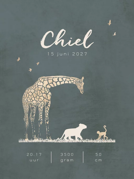 Groen/blauwe jungle canvasposter met houten magneetlatjes om de geboorte van jullie zoon te vieren. Op deze geboorteposter Chiel staat een giraf, welpje en een aapje. Er is ruimte voor de geboortegegevens. Ook superleuk om te geven als kraamcadeautje en op te hangen inde babykamer.