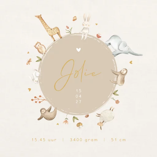 Lieve canvasposter met houten magneetlatjes om de geboorte van jullie dochter te vieren. Op deze geboorteposter Jolie een wereldbol met verschillende vrolijke aquarel dieren, waaronder een olifantje, konijntje, giraffe, schaapje en uiltje. Leuk om op te hangen in de babykamer.