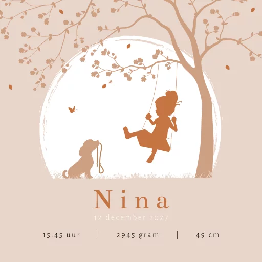 Hippe canvasposter met houten magneetlatjes om de geboorte van jullie dochter te vieren. Op deze geboorteposter Nina een silhouet van een meisje op de schommel, een boom en een lief klein hondje. Leuk om op te hangen in de babykamer.