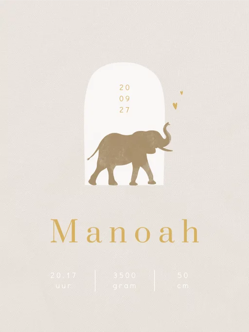 Unisex canvasposter met houten magneetlatjes. Canvasposter Manoah heeft beige tinten en een linnenlook achtergrond. Op de poster staat een olifant met een aantal hartjes. Er is ruimte voor de geboortegegevens.