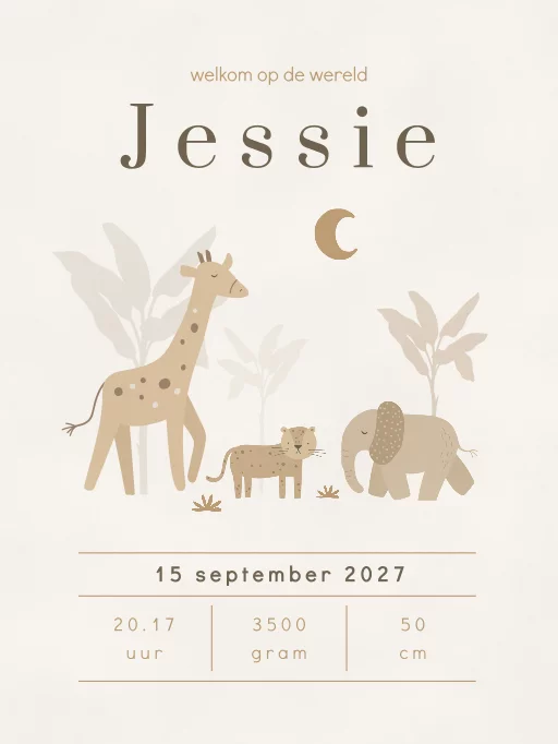 Deze hippe unisex canvasposter met houten magneetlatjes is perfect voor een stoere jongen of meisje. Op deze neutrale jungle geboorteposter Jessie zie je een ton sur ton landschap in aardetinten met palmbomen en jungle en safaridieren, een giraffe, panter en olifantje.