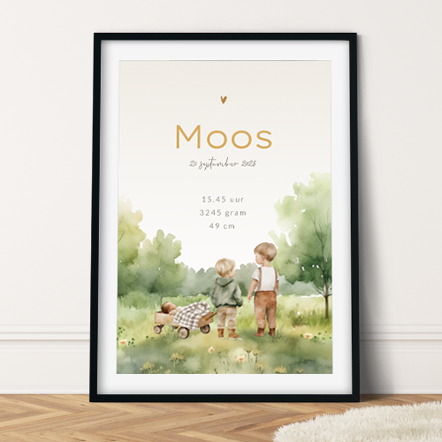 Geboorteposter Moos voor een jongen. Op deze geboorteposter zie je twee broers die naast een karretje in het bos staan waar hun baby broertje in ligt.